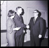 KEL 548 Shaking hands after a banquet of the Idaho Section of the American Society of Range Management are, left, Dr. Earl Swanson, professor of anthropology and director of the ISU museum, and Ralph Samson, out-going president of the Idaho unit. Looking on is Mrs. Swanson. The men are dressed in suits and ties and Mrs. Swanson is dressed in a dress suit. A patterned wallpaper wall and some double-doors are behind them.