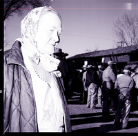 KEL 554 Mrs. Howard Lapray stands to one side of the auction crowd listening to the sounds of auction on the farm estate of her late husband. She is wearing a coat and a scarf over her head. A crowd of men, a house, and some trees are in the background.