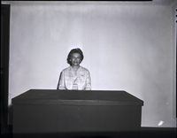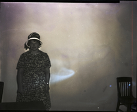 KEL 375 Mrs. Robert Brackett, president of the Twin Falls Baptist Women's Mission Society, stands against a wall. She is wearing a floral print dress and a hat. A table is in front of her, and a chair is in the corner of the room.