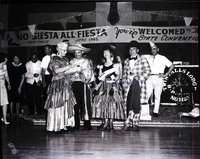 KEL 220 Winners for a craziest costume contest receive their awards at a BPOE convention held in Twin Falls. Mr. and Mrs. Charles Engalls of Boise, winners of the best dressed couple award, are dressed in Spanish clothing, and Charles Engalls wears a large sombrero. Beside them are the winners of the best dressed individual awards, Mrs. Arthur Swanson, dressed in a fancy ruffled dress, and Frank Hike, dressed in a checkered coat with a bow tie and bowler hat. A man in a pointed hat and a group of people stand behind them on the stage. A large banner hanging over the stage reads "No Siesta All Fiesta, Twin Falls, June 1965" and "You're welcomed to the state convention." A podium on stage reads "Twin Falls Lodge B.P.O.E. No 1182" around the Elks Club seal.