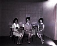 KEL 218 From left to right, Miss Twin Falls pageant candidates Jill Dunagan, Sherry Stuart, and Carol Christensen sit in chairs in front of a table. A telephone sits on the table. They are all wearing dresses.