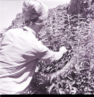 KEL 926 001 A woman picks stinging nettles in a weed patch in the Snake River Canyon. Rocky canyon cliffs are visible in the background.