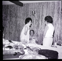 KEL 932 Three members of the Twin Falls County Democratic Women visit at a potluck luncheon held in honor of Mrs. R. L. Summerfield at the home of Tommy Walker. On the table behind them are various dishes of food, a chocolate cake, and a pie. In the center of the table is a goblet filled with water and floating flowers. In the corner beside the women are some purses. A lamp hangs on the wall above them.