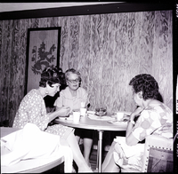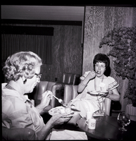 KEL 932 001 Two members of the Twin Falls Democratic Women sit in chairs eating from plates of food at a potluck luncheon held in honor of Mrs. R. L. Summerfield at the home of Tommy Walker. Between them is a round table, and on the table are some coffee cups and a clear goblet filled with water and floating flowers as a centerpiece. On the wall above them are a lamp and a photograph of a canyon wall.
