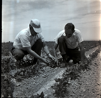 KEL 928 Donald Youtz, Twin Falls County agent, left, and Marshal LeBaron, superintendent of the Twin Falls branch of the University of Idaho Experiment Station, right, check wind damage to beans in a field. The leafy tops of the bean plants in the field stretch into the background.